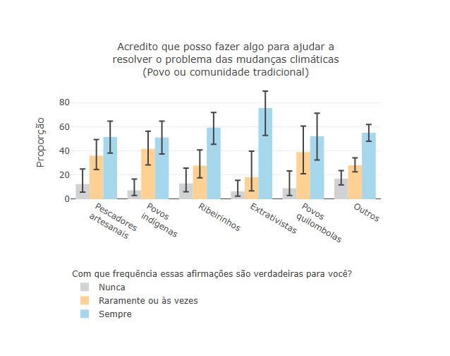 Apesar do sentimento de culpa ser maior, os povos e comunidades tradicionais também são os que mais acreditam que sempre podem fazer algo para ajudar a resolver os problemas das mudanças climáticas: 75,4% entre os extrativistas contra 46,8% do total.