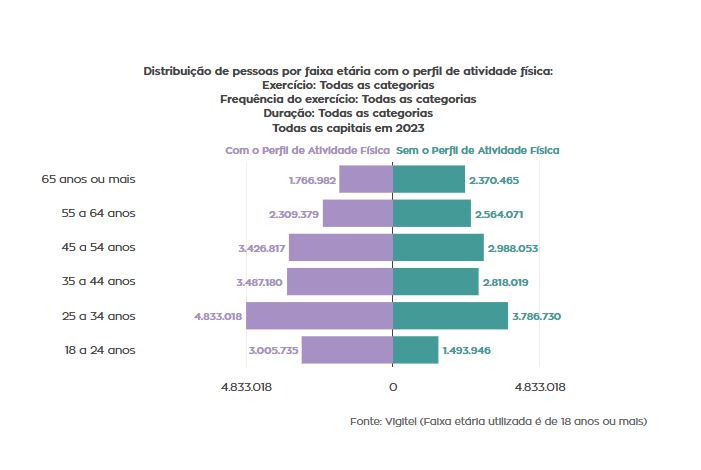 No Brasil, apesar de 54% da população adulta das capitais realizar algum tipo de atividade física, independentemente da intensidade e frequência, a prática diminui consideravelmente com a idade: é mais comum entre pessoas de 18 a 24 anos (66,8% nessa faixa etária) e cai entre aqueles com 65 anos ou mais (42,7% nessa faixa etária), segundo a Vigitel 2023.