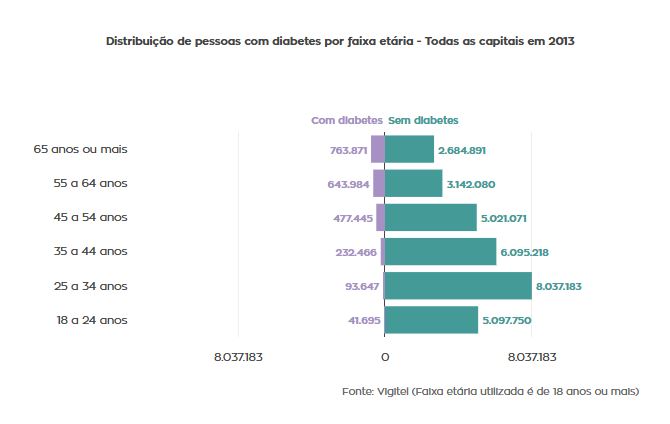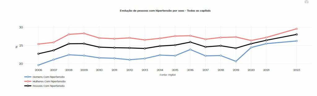 Já a hipertensão atinge 28,1% da população de 18 ou mais anos de idade das capitais. Estes seguem padrões semelhantes de maior prevalência em mulheres (29,6% para mulheres e 26,3% para homens). Além disso, há aumento gradual com a idade (alcançando 64,6% para 65 ou mais anos de idade).