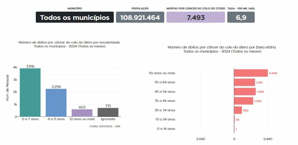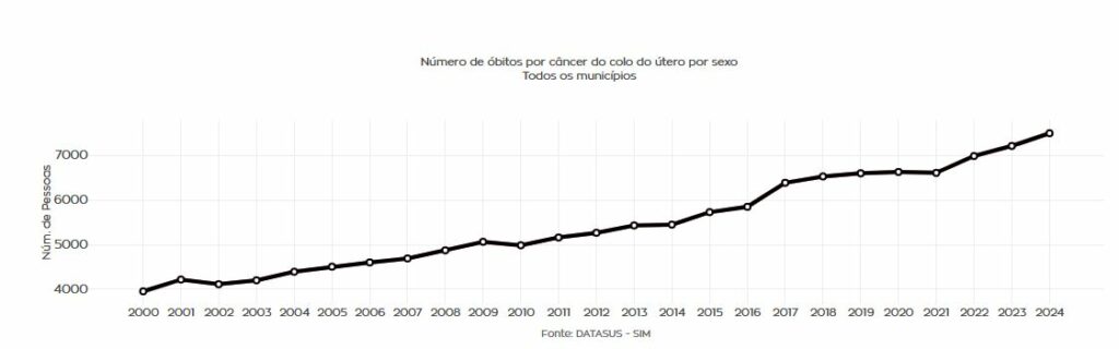 Os dados de mortalidade ajudam a dimensionar ainda mais esse cenário. Informações do Sistema de Informações sobre Mortalidade (SIM), do DATASUS, disponíveis no Observatório de Saúde Pública, mostram que, em 2024, foram registrados 7.493 óbitos por câncer do colo do útero no Brasil.