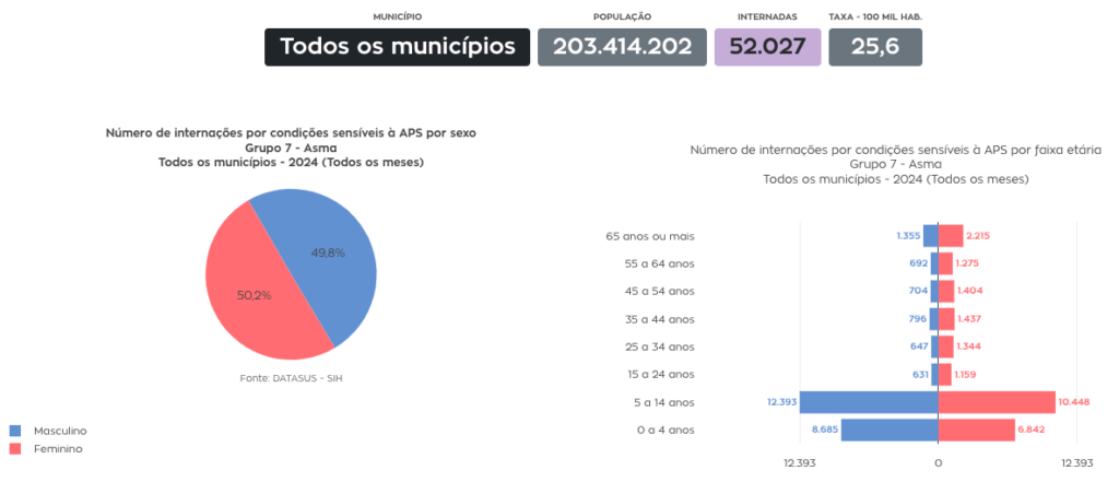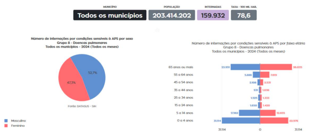 Entre os indicadores analisados pelo Observatório estão também as internações por doenças pulmonares e asma, que ajudam a compor o panorama das condições que demandam acompanhamento contínuo no sistema de saúde. Em 2024, foram registradas mais de 159 mil internações por doenças pulmonares e 52 mil por asma em todos os municípios do Brasil. Esses dados são do SIH-DATASUS disponíveis no Observatório da Saúde Pública. Nas duas condições, os grupos mais afetados foram crianças de zero a 4, e 5 a 14 anos, bem como idosos acima de 65 anos.