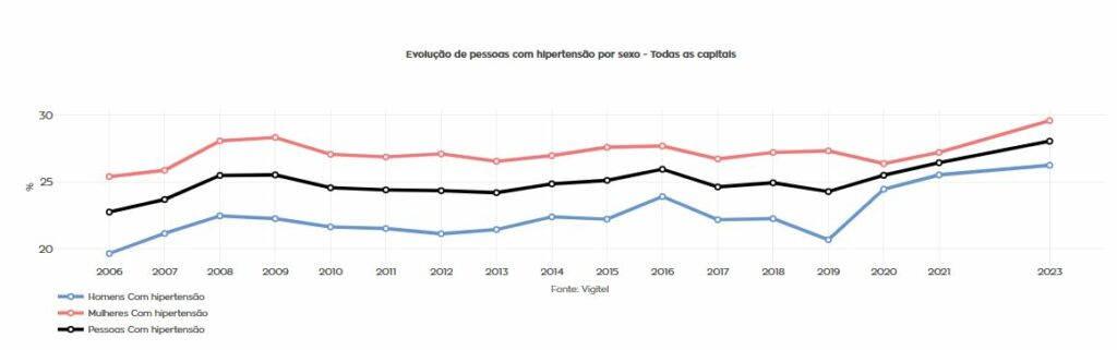 No Brasil, os indicadores de saúde ajudam a dimensionar quais condições já concentram maior impacto sobre a população. Dados do Vigitel, disponíveis no Observatório da Saúde Pública da Umane, mostram que a hipertensão arterial, um dos principais fatores de risco para doenças cardiovasculares, atingia 28,1% das pessoas que vivem nas capitais brasileiras em 2023, com prevalência mais elevada entre pessoas com 65 anos ou mais (64,6%). A série histórica também mostra tendência de crescimento da prevalência de hipertensão nas capitais ao longo dos anos.