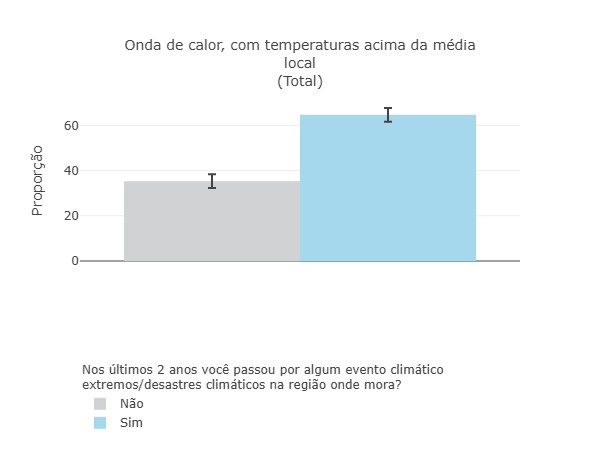 O levantamento também mostra que 64,7% da população relatou ter vivenciado ondas de calor extremo nos últimos dois anos, e 82,4% responderam acreditar que o aquecimento global está influenciando o aumento da temperatura média, indicando que a exposição a eventos climáticos extremos ocorre em diferentes contextos territoriais.